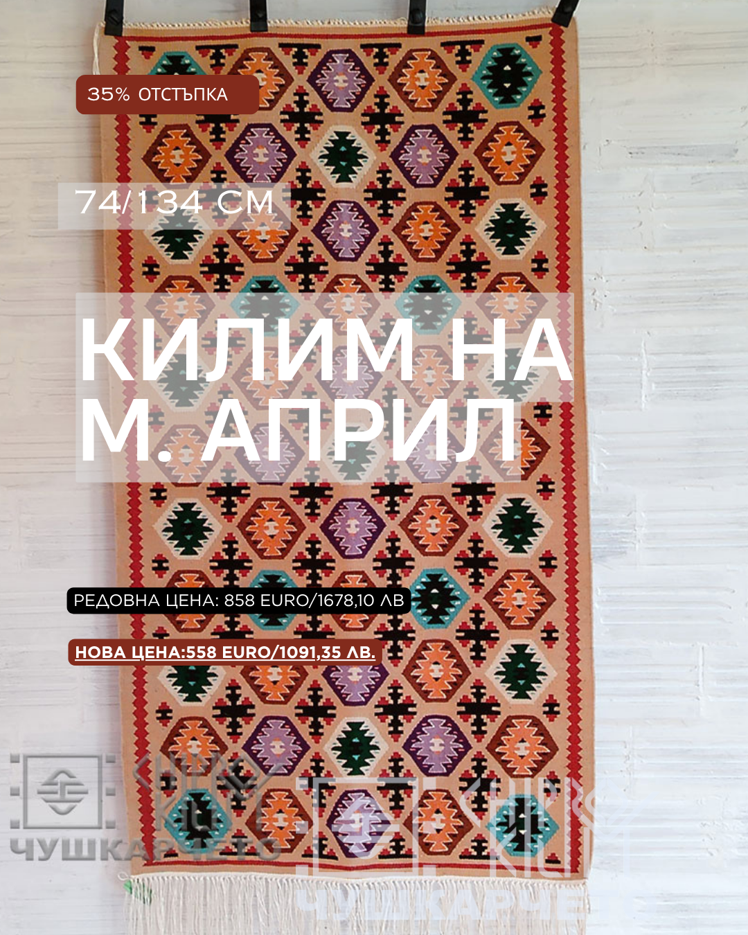 Всеки месец подбираме Килим, който се предлага на промоционална цена — възможност да притежавате ръчно тъкано изделие с културна стойност при специални условия.